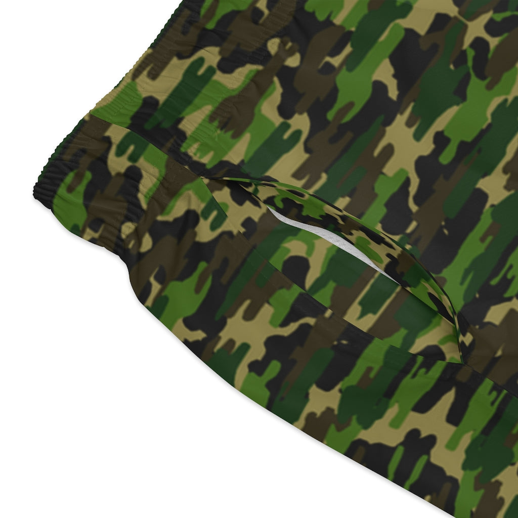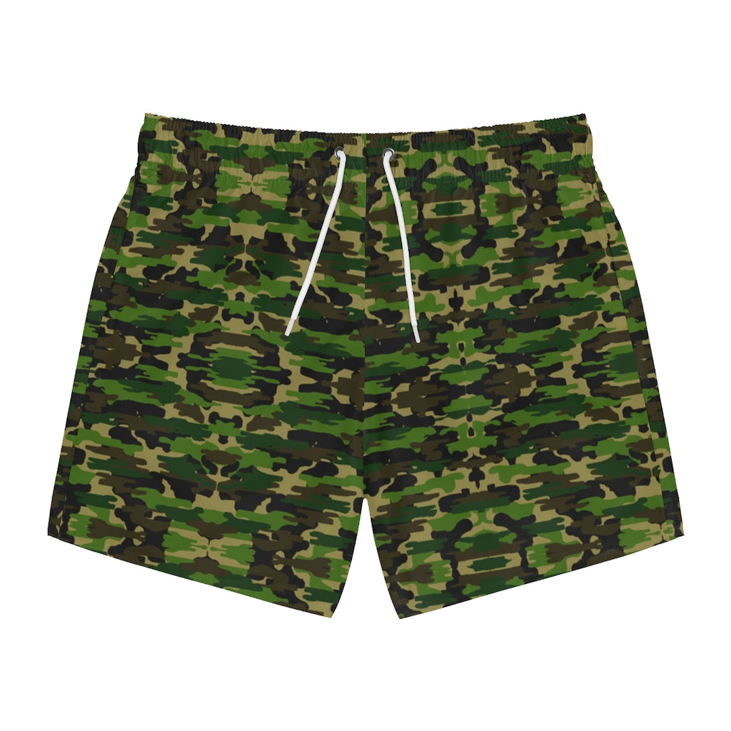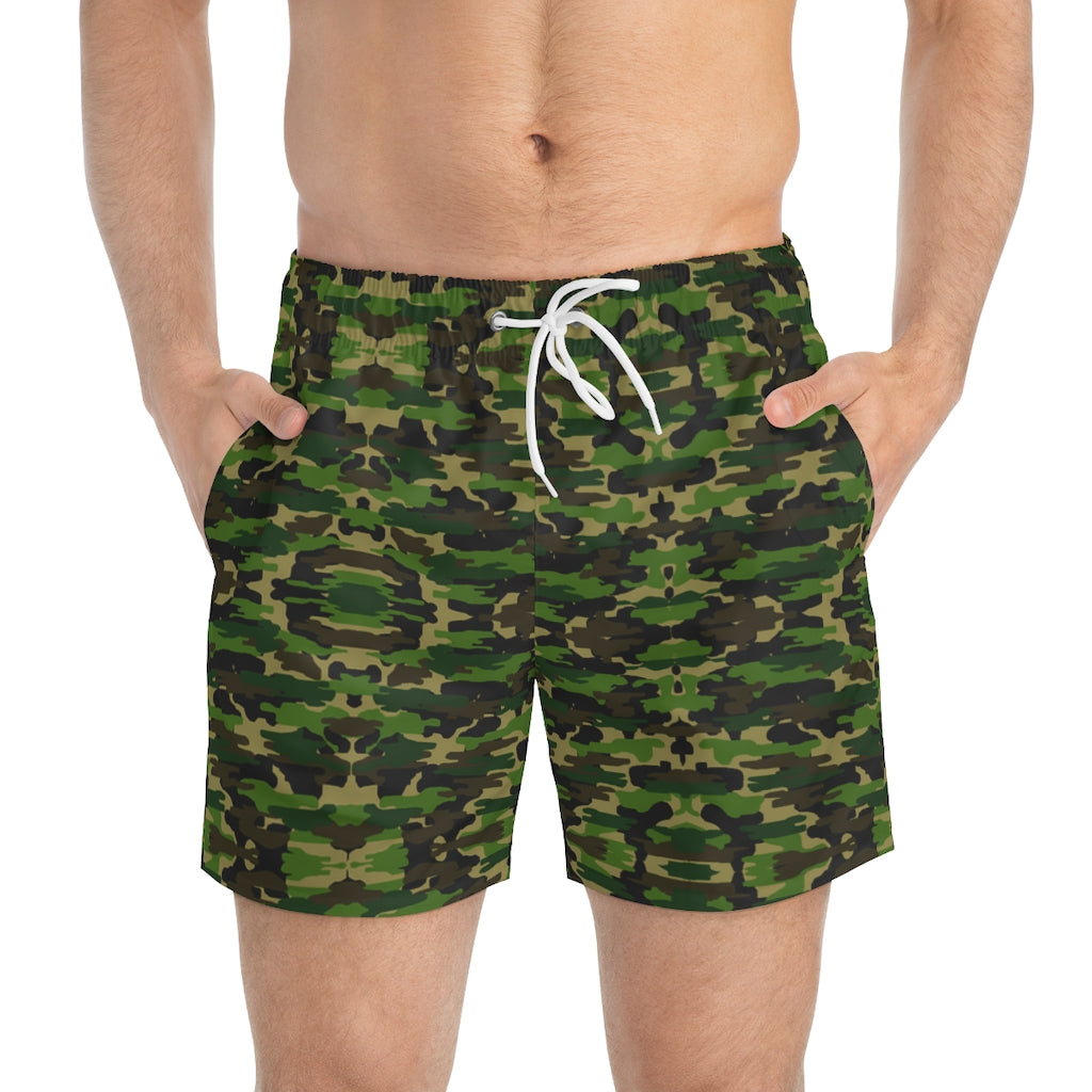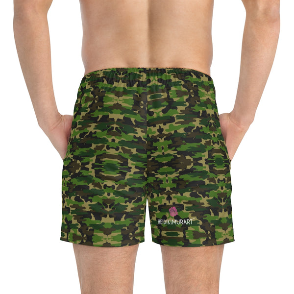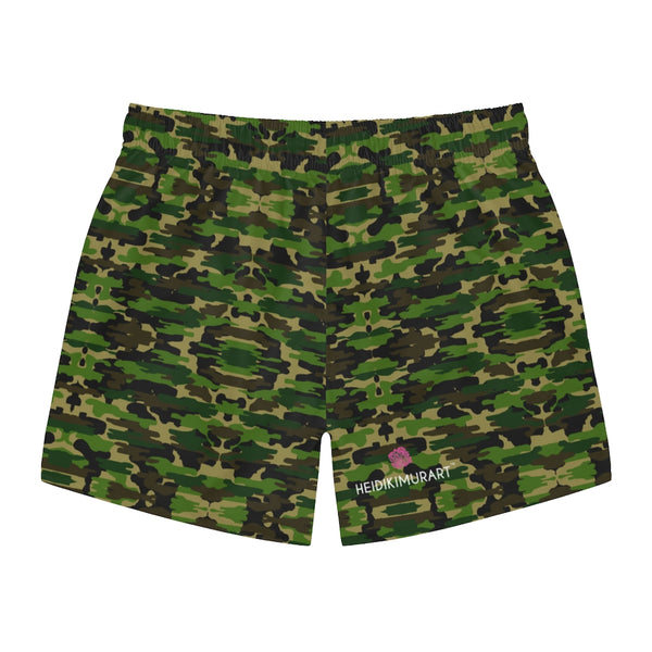 Green Camo Men's Swim Trunks, Green and Brown Camouflaged Military Army Print Best Designer Printed Swim Trunks For Men (US Size: XS-3XL) Mid-Length Shorts Beach Pockets Mesh Lining Drawstring Luxury Cool Guys Casual Bathing Suit Plus Size Available Swimwear For Men