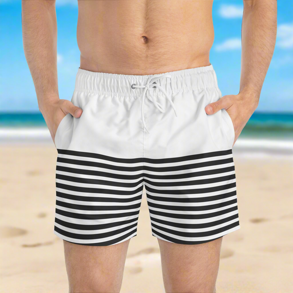 Black White Striped Men's Swimwear, Best Horizontally Striped Print Swim Trunks For Men (US Size: XS-3XL) Striped Print Mid-Length Shorts Beach Pockets Mesh Lining Drawstring Luxury Cool Guys Casual Bathing Suit Plus Size Available Swimwear For Men