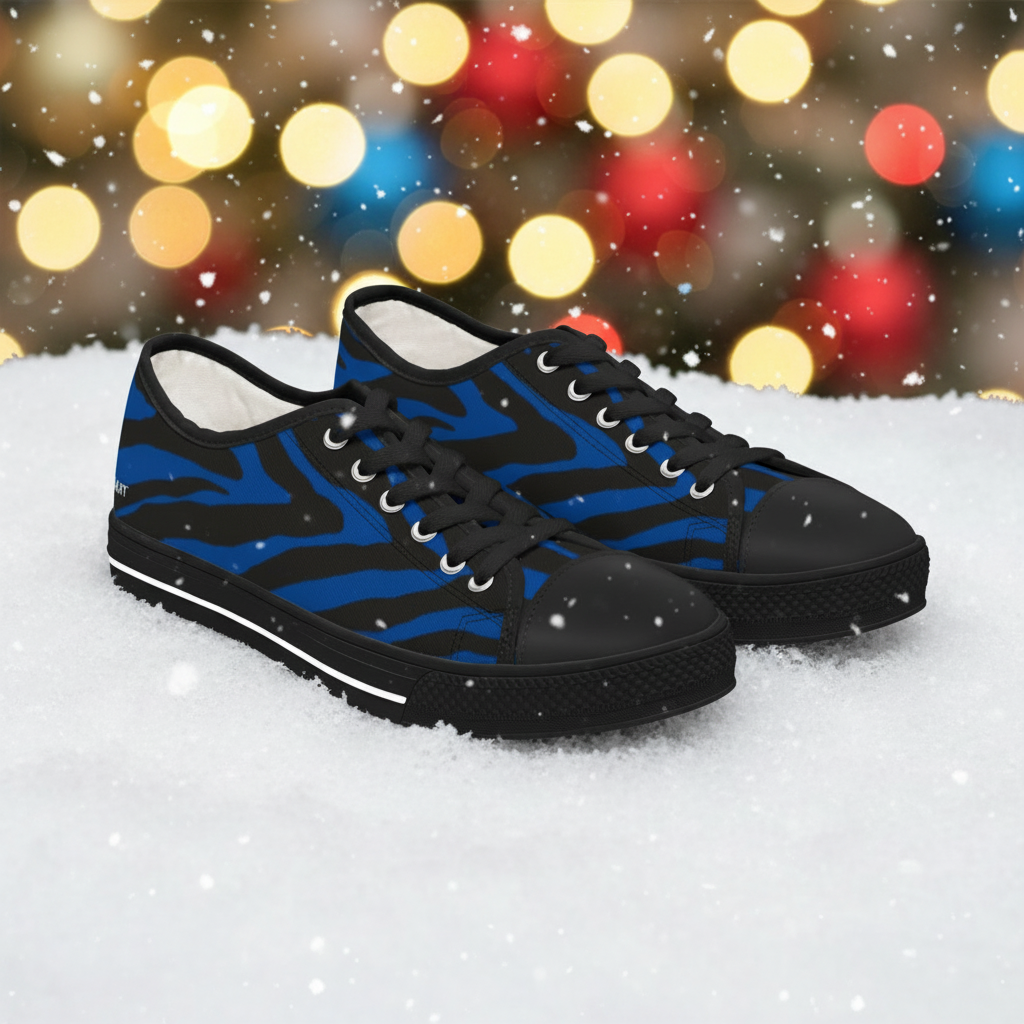 Are you looking for a pair of blue and black zebra striped animal print designer women's low tops? Check out these blue and black zebra stripes animal print designer low top women's designer sneakers for ladies. Made with breathable polyester canvas and featuring hi-poly deodorant memory foam insoles, these designer women's low top sneakers bear all the marks of an awesome shoe. Choose between black or white sole and laces, and enjoy the silver metal eyelets along with the lace-up closure. Made to order, brand new women's low top designer best fashion canvas sneakers, and we can ship worldwide internationally to most countries just for you.