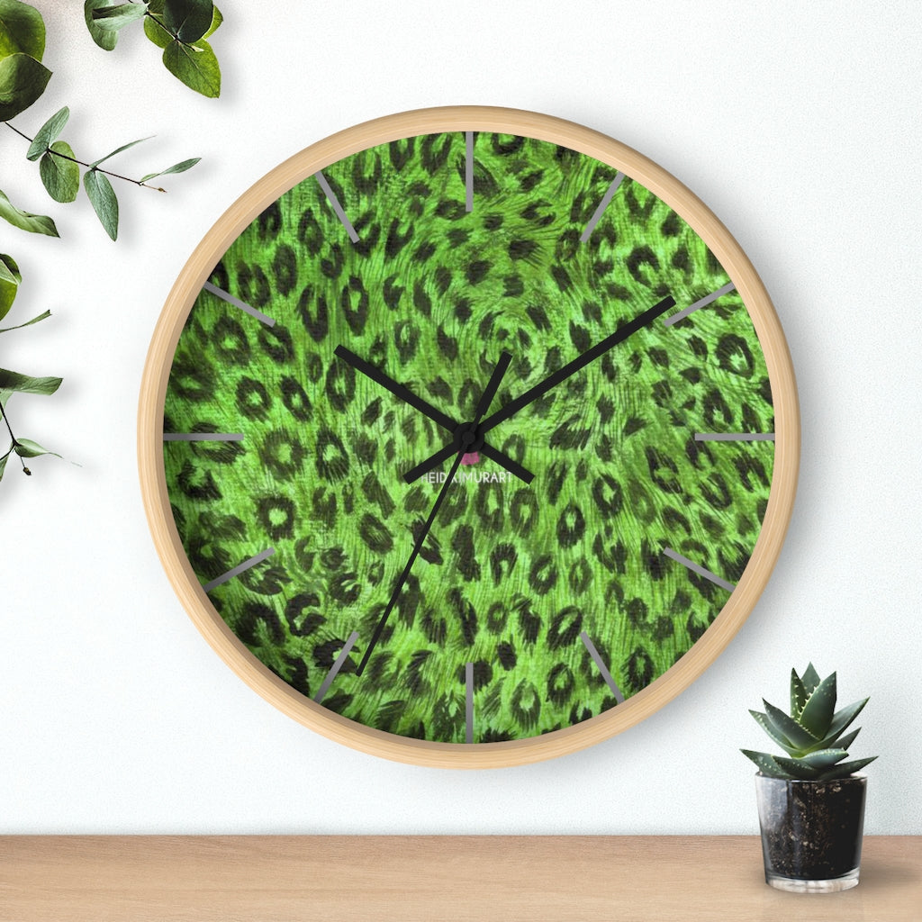 Green Leopard Print Wall Clock, Numeric 10 inch Diameter Wall Clock, Large Round Wood Girl Children Bedroom Wall Clock