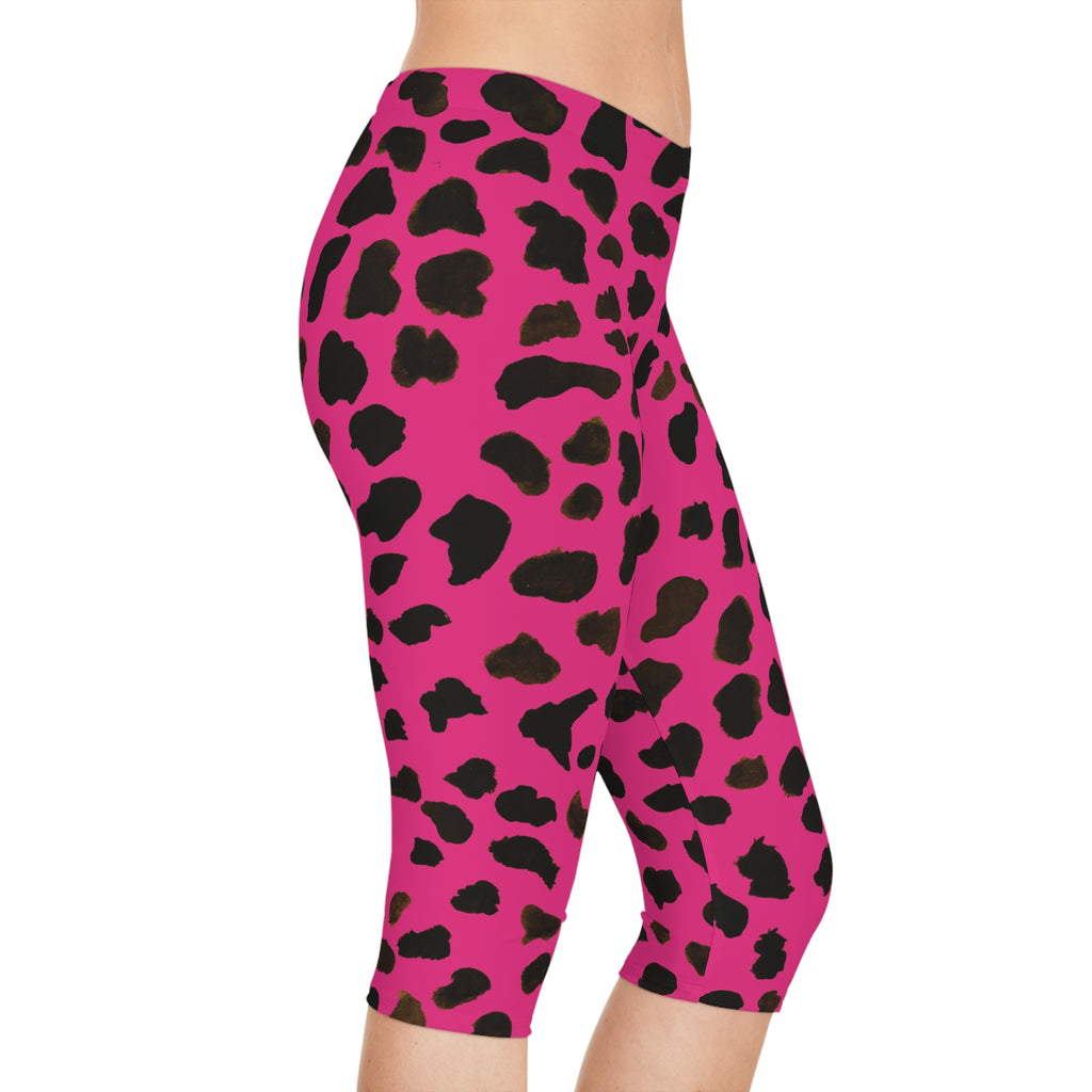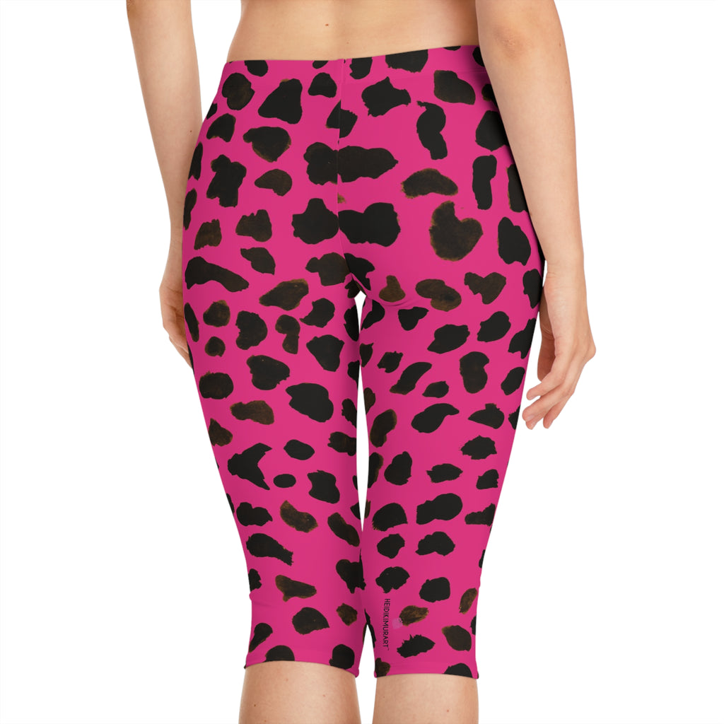 Pink Cow Spots Women's Tights, Cow Spots Print Women's Capri Leggings, Cow Animal Print American-Made Best Designer Premium Quality Knee-Length Mid-Waist Fit Knee-Length Polyester Capris Tights-Made in USA (US Size: XS-2XL) Plus Size Available