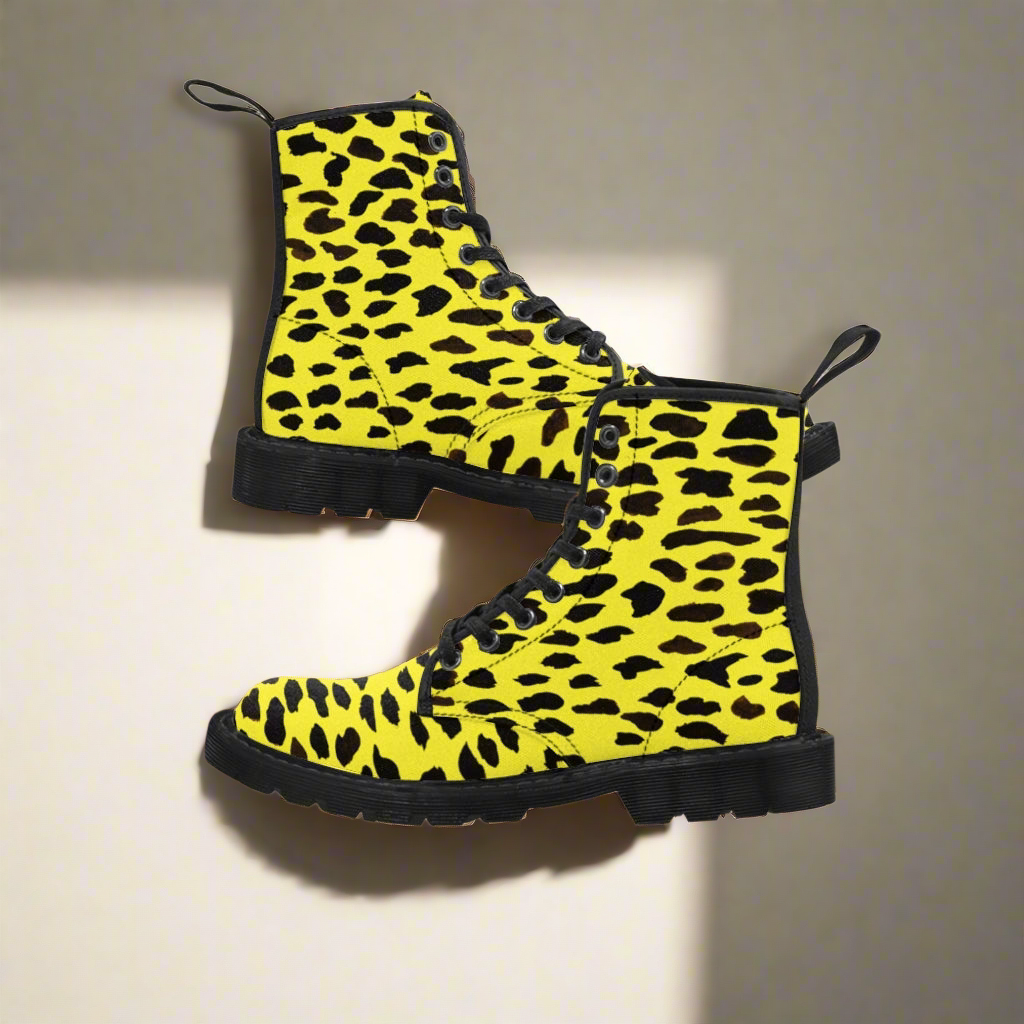 Sick of boring, plain-looking, cheaply made mass-produced men's lace-up cap toe boots? Check out these one of a kind, unique bright eye-catching yellow and brown cheetah animal print fashionable men's classic winter boots that we designed just for you. Walk with confidence in a pair of these unique men's yellow and brown cheetah animal print cap toe lace-up fashion winter boots! Extremely comfortable stylish men's boots with a high quality print are made to last and to impress - a truly original way to express oneself and to inspire new fashion trends on the go. Made to order and shipped internationally. An one-of-a-kind pair of fashionable men's winter boots designed by Heidi Kimura Art. These nylon-canvas men's classic lace boots provide soft and comfortable wearing for men. It has a breathable foamed insole to ensure anti-heat, anti-moisture and anti-corrosion conditions. Perfect for everyday wearing and to show a unique sense of style.