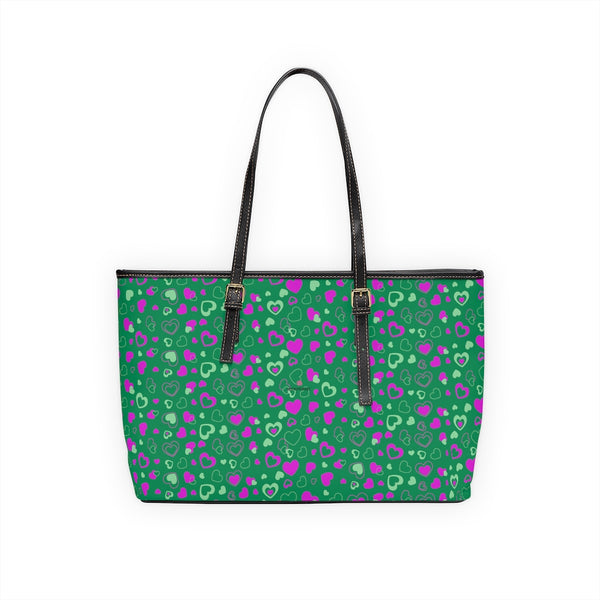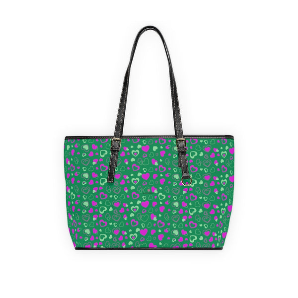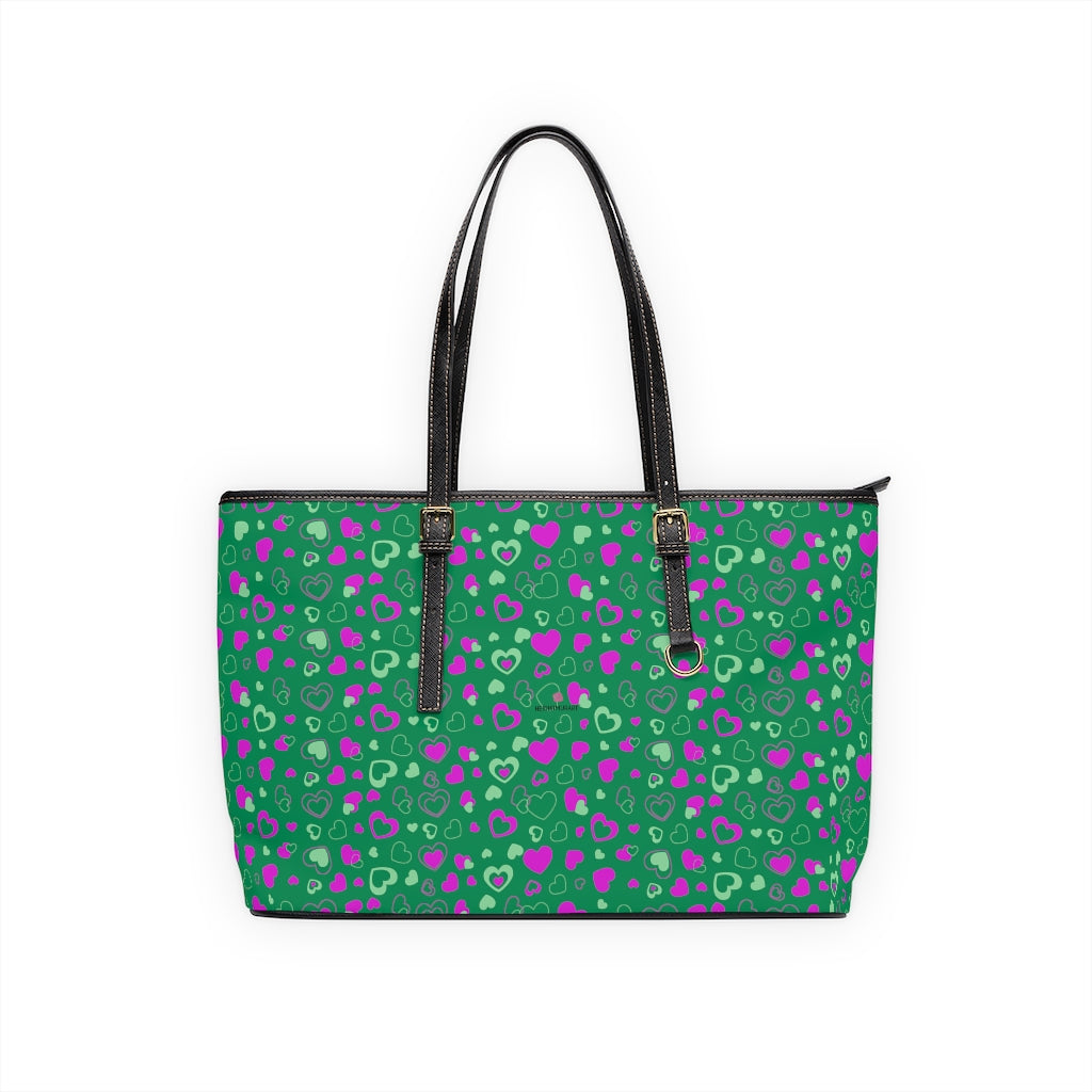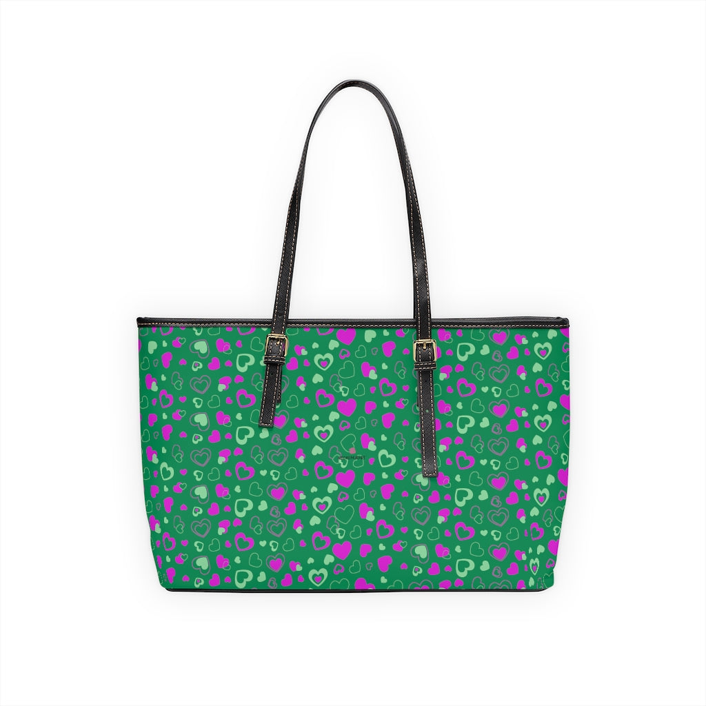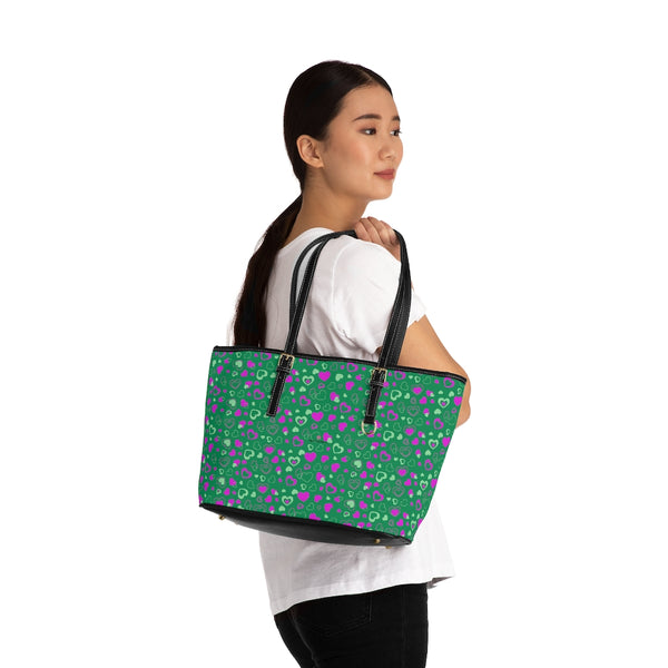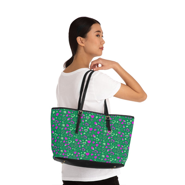 Green Hearts Print Tote Bag, PU Leather Shoulder Hand Work Bag