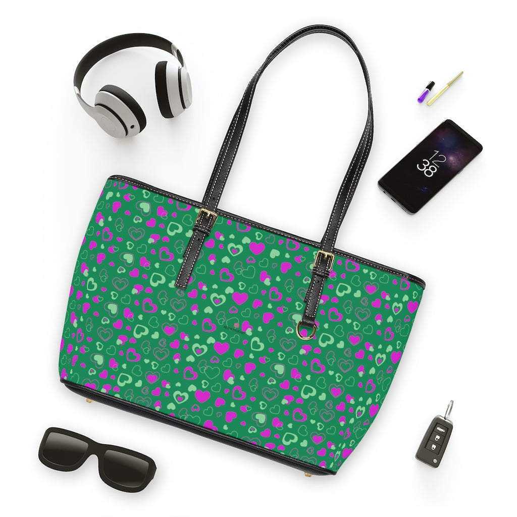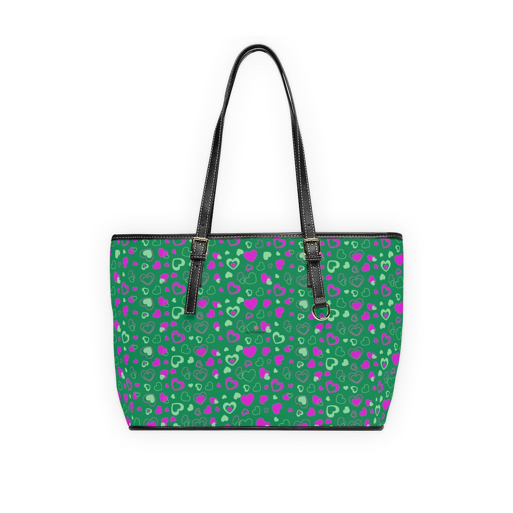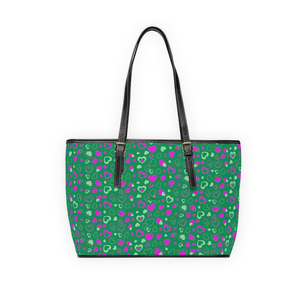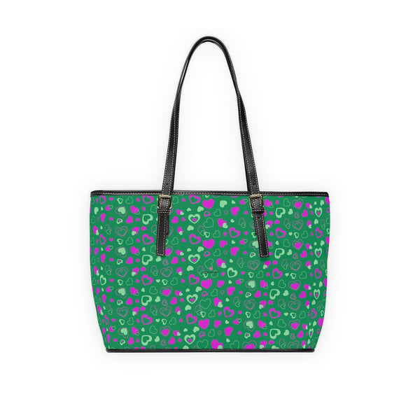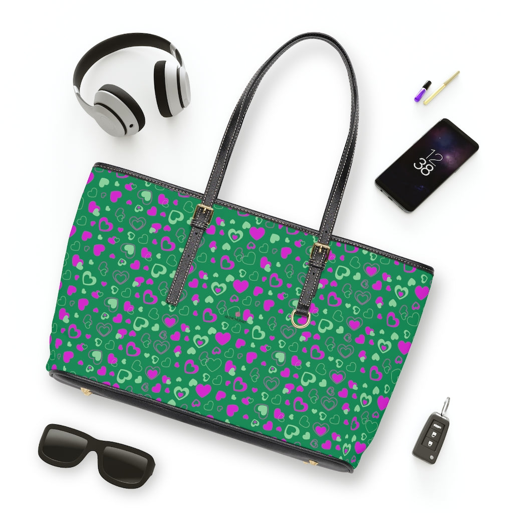 Green Hearts Print Tote Bag, PU Leather Shoulder Hand Work Bag