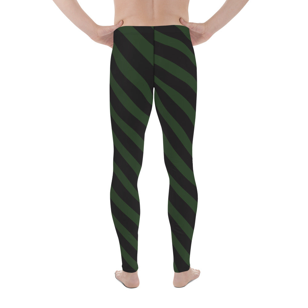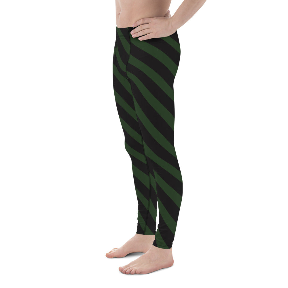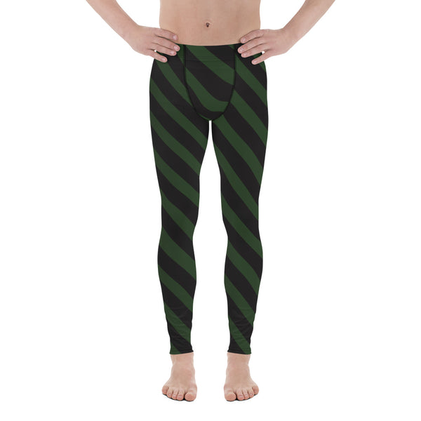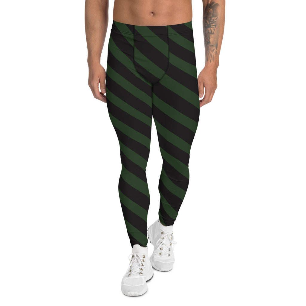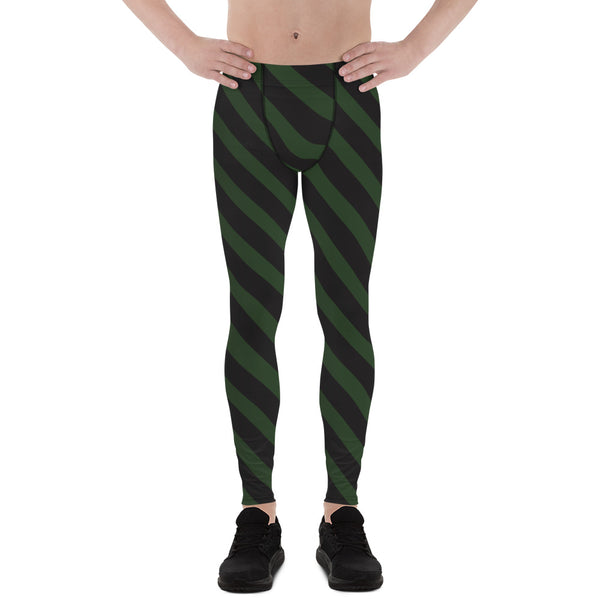 Pine Green Striped Meggings, Diagonally Stripes Designer Men's Leggings