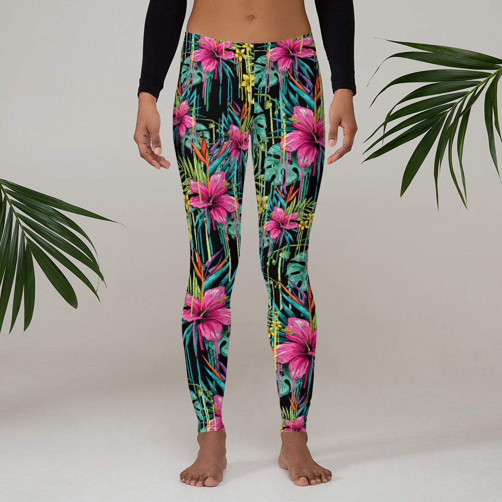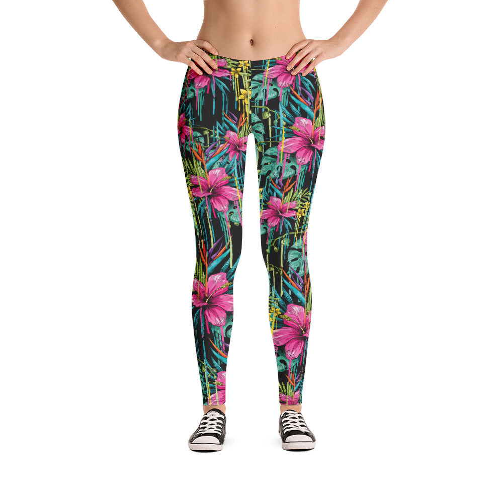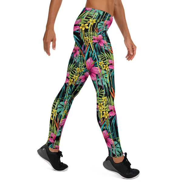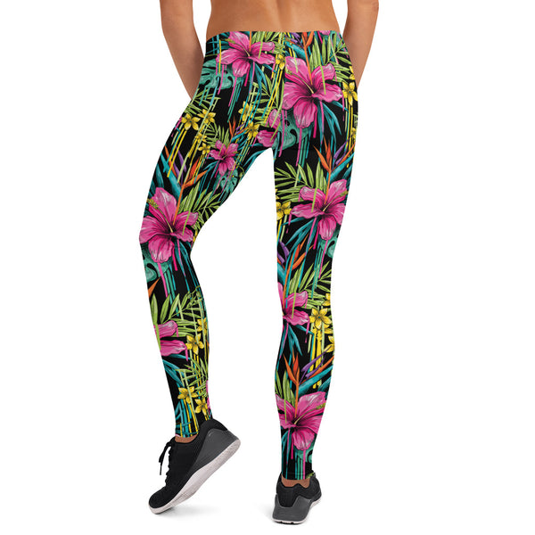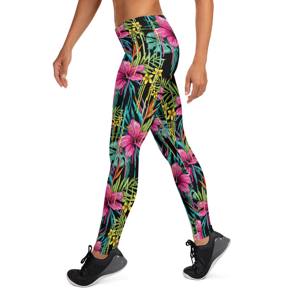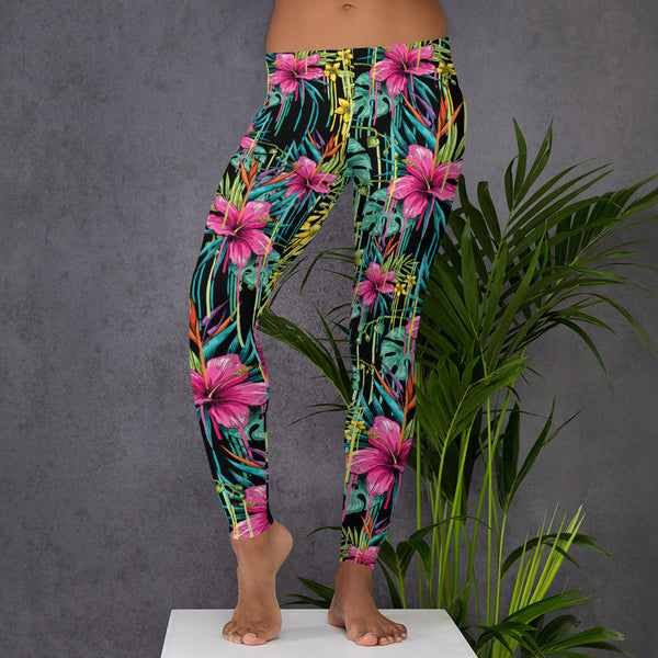 Pink Floral Leggings, Tropical Print Women's Premium Tights-Made in USA/EU