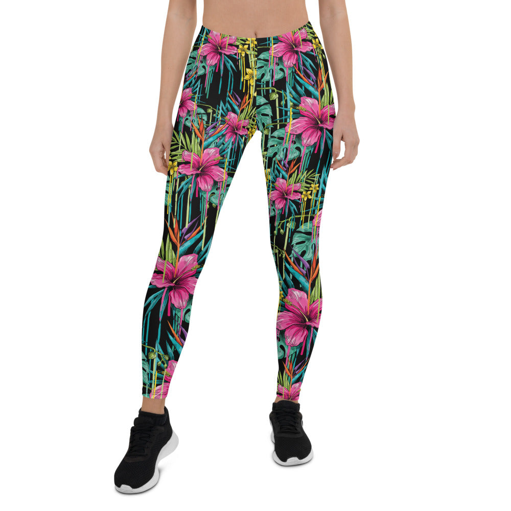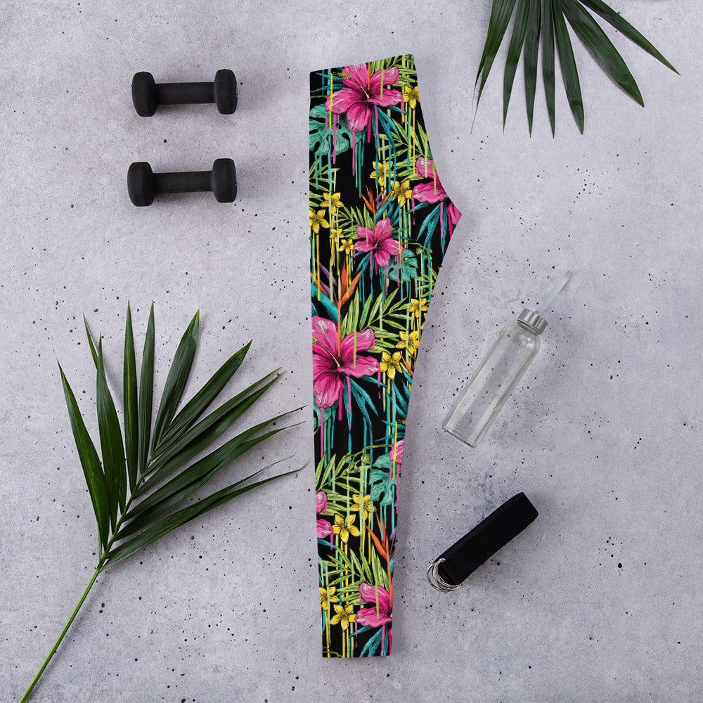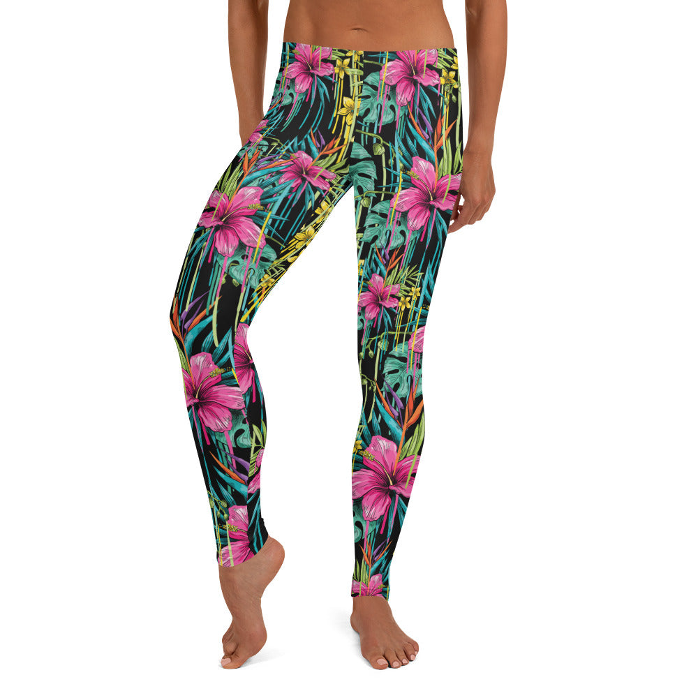 Pink Floral Leggings, Tropical Print Women's Premium Tights-Made in USA/EU