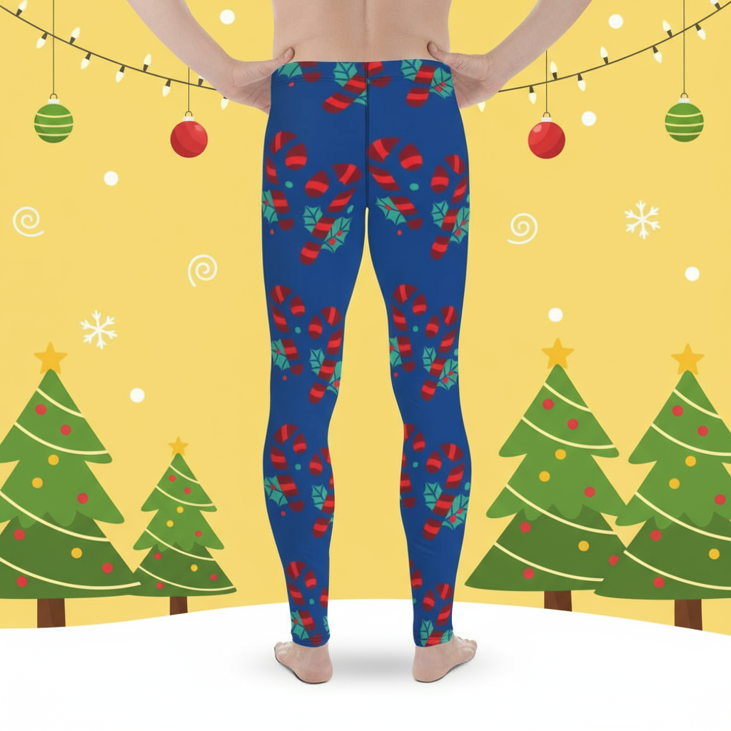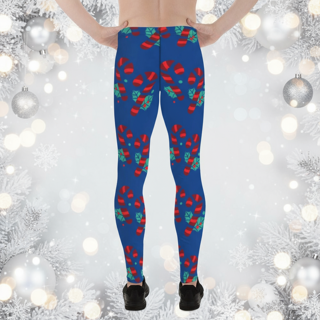 Blue Christmas Candy Men's Leggings, Blue and Red Colorful Christmas Candy Cane Style Gym Tights For Men - Made in USA/EU/MX