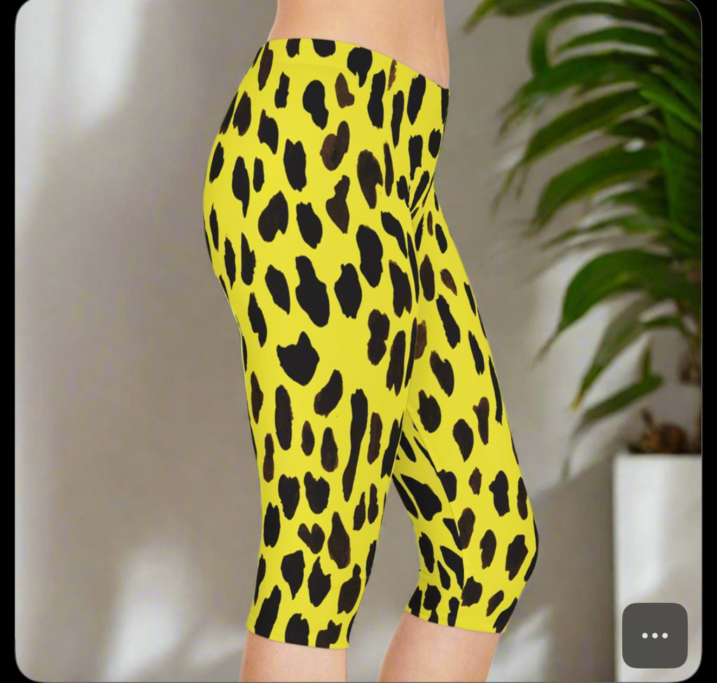 Yellow Cow Spots Women's Tights, Animal Print Women's Capri Leggings, Yellow Cow Animal Print American-Made Best Designer Premium Quality Knee-Length Mid-Waist Fit Knee-Length Polyester Capris Tights-Made in USA (US Size: XS-2XL) Plus Size Available