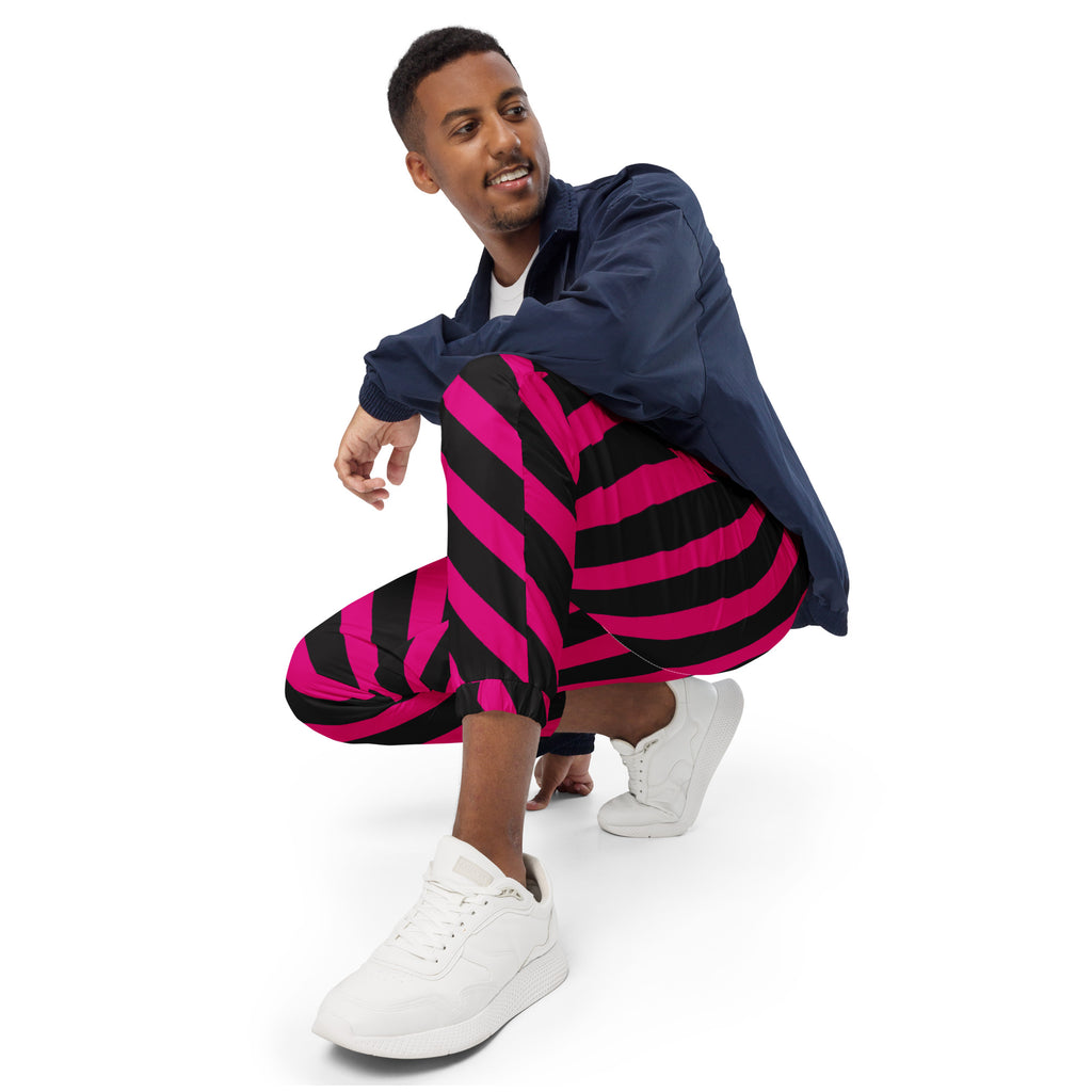 These designer casual hot pink and black diagonally striped best unisex track pants are your new go-to piece for working out or styling a streetwear outfit. These men's or women's trouser pants are water resistant, lightweight fabric and mesh lining provide comfort, while elastic ankle cuffs will make it easy for you to show off your kicks. Style it with a windbreaker for a complete look and feel. We offer worldwide shipping just for you to most countries. All our items are brand new and made to order just for you.