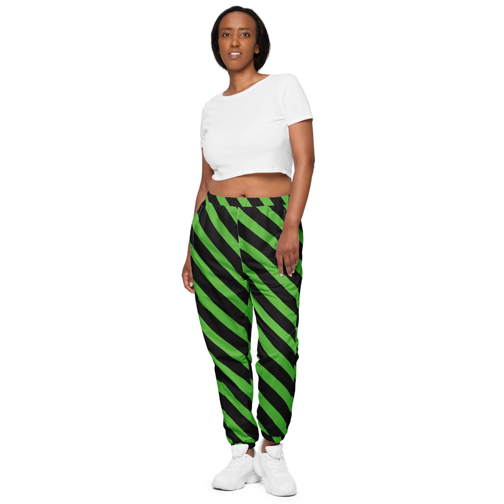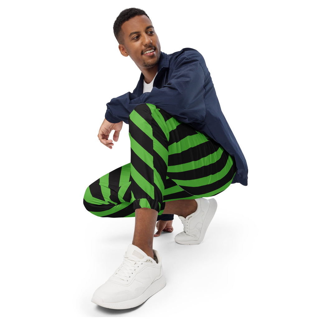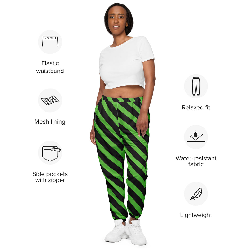 These designer casual green and black diagonally striped best unisex track pants are your new go-to piece for working out or styling a streetwear outfit. These men's or women's trouser pants are water resistant, lightweight fabric and mesh lining provide comfort, while elastic ankle cuffs will make it easy for you to show off your kicks. Style it with a windbreaker for a complete look and feel. We offer worldwide shipping just for you to most countries. All our items are brand new and made to order just for you.