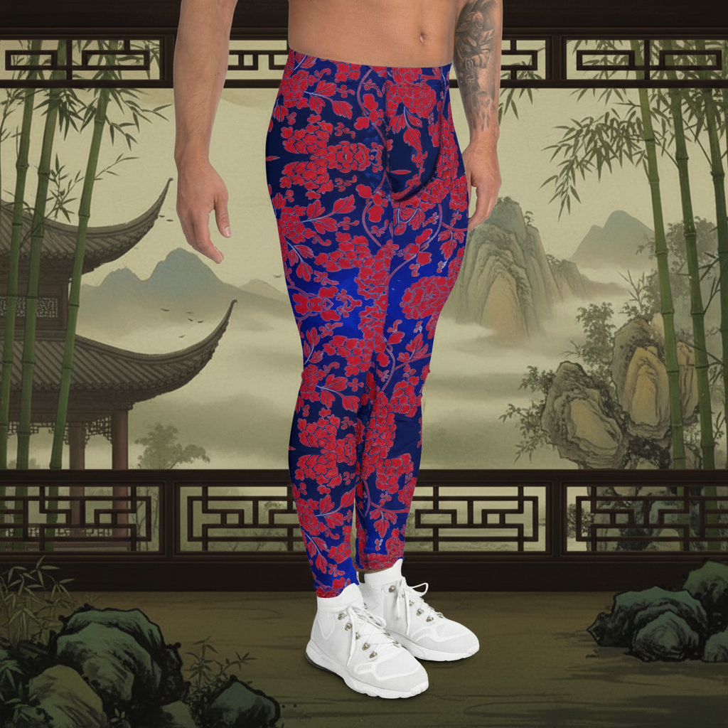 Red Blue Floral Men's Leggings, Best Blue and Red Oriental Style Floral Print Meggings Compression Tights - Made in USA/EU/MX